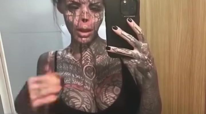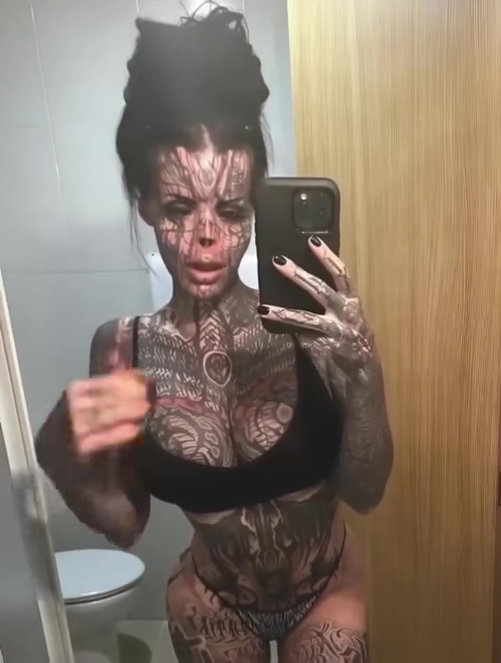 Now a dedicated body-mod enthusiast, her entire upper body is covered in tattoos. Her current look also includes jet-black hair, a split tongue, and tattooed eyes.