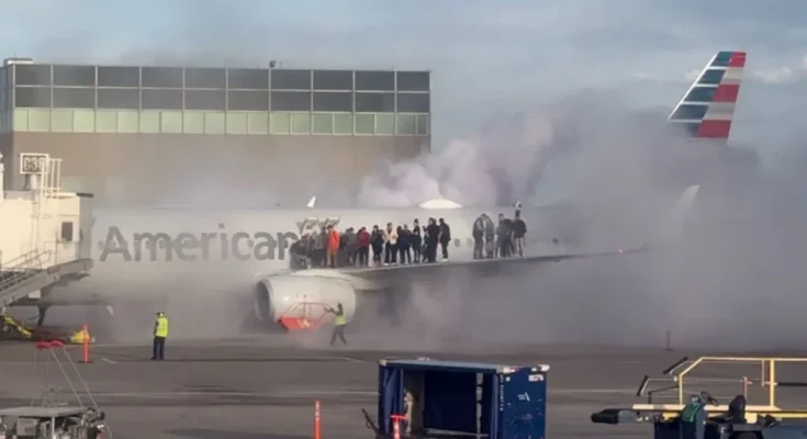 Airplane passengers are seen exiting the plane and standing on the wing as smoke rises around them at the Denver airport on Thursday. @steve_schilsky/X