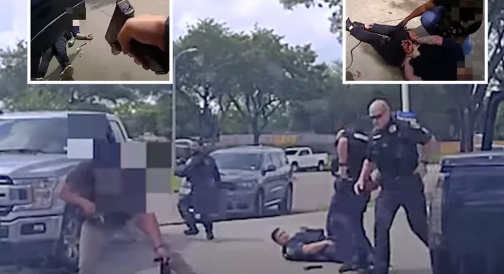 Various camera angles show how the shooting unfolded through footage from the Houston Police Department (HPD) officers’ body-worn cameras and the dash-cam footage from their vehicle. Officer J. Sallee and his partner, Officer M. McMurtry, are seen approaching the suspect’s vehicle after making the traffic stop.