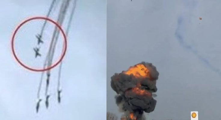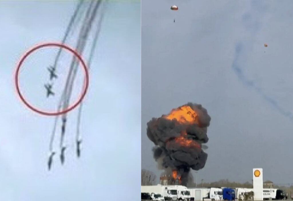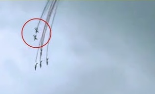 Terrifying footage shows a group of jets flying in an organized line and firing colored smoke flares when two planes suddenly collide mid-air.