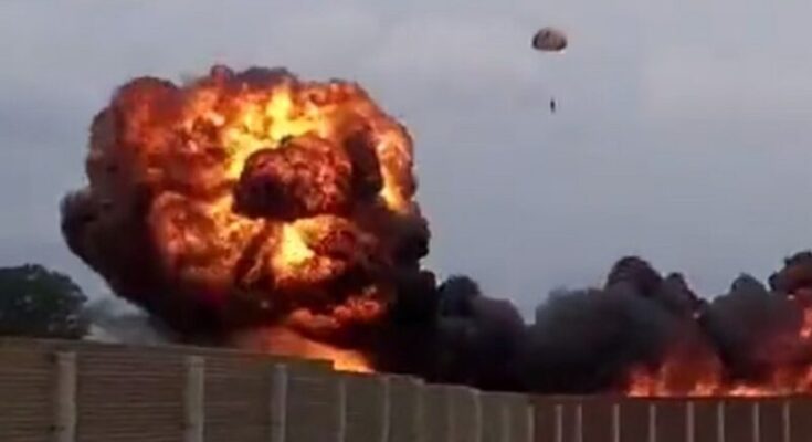 A video of the incident was captured by a bystander which shows the pilot, named Captain Oscar Del Do, ejecting from the aircraft and his parachute open. The fire brigade confirmed he is also being treated in hospital.